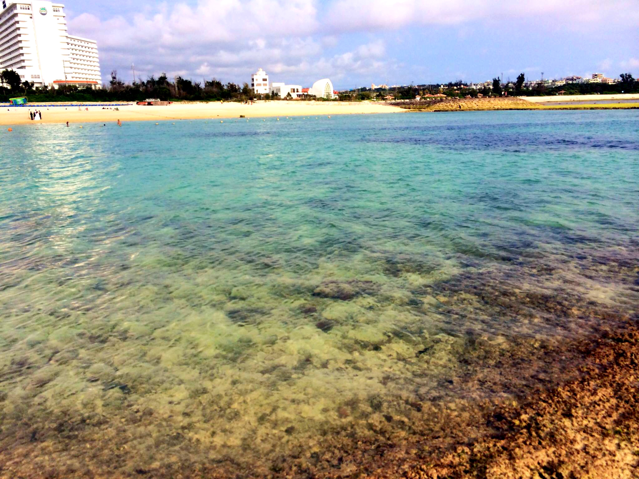 After working up a bit of a sweat, we made our way back to the car and drove a few minutes in the opposite direction to visit Okuma Beach. Any time I Google “Okinawa beaches”, Okuma is the one that truly dazzles me. Since we were in the area, we had to pay it a visit, even if it was a bit cloudy and chilly. It is a Japanese resort area in part, but we were surprised to see that the U.S. Air Force actually has command of a large chunk of it, as a “recreation facility.” Chuck and I are both not sure how we feel about the military spending money to run the place, and honestly, I had hoped for a more unadulterated, local beach, but none of this changed the fact that Okuma is absolutely beautiful and I will most certainly go again when the weather warms up. Even with the clouds and wind, it was just perfect – and the sun managed to peek out once or twice!