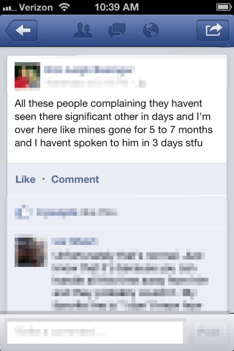 A young new military wife from Chuck’s unit posted this today. It’s a little negative and dramatically put for my taste, but true nonetheless. And we’ll go way longer than 3 days without talking, most likely. Last deployment, I went as long as 4 weeks without hearing anything! It’s not easy hearing a friend complain about a measly business trip. Such is the life… we are more independent because of it 🙂