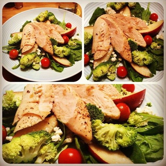 See, I promise I eat healthy most of the time. Baked chicken on a bed of spinach, pears, broccoli, and tomatoes, sprinkled with feta cheese. Of course, there was apple crisp for dessert…does that ruin it?